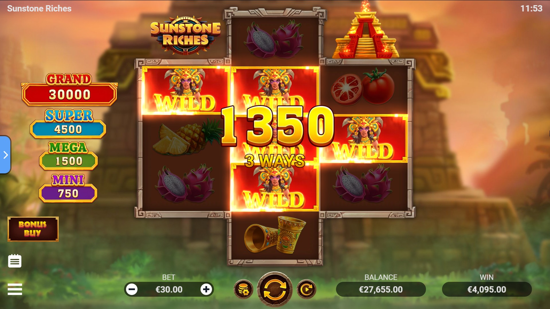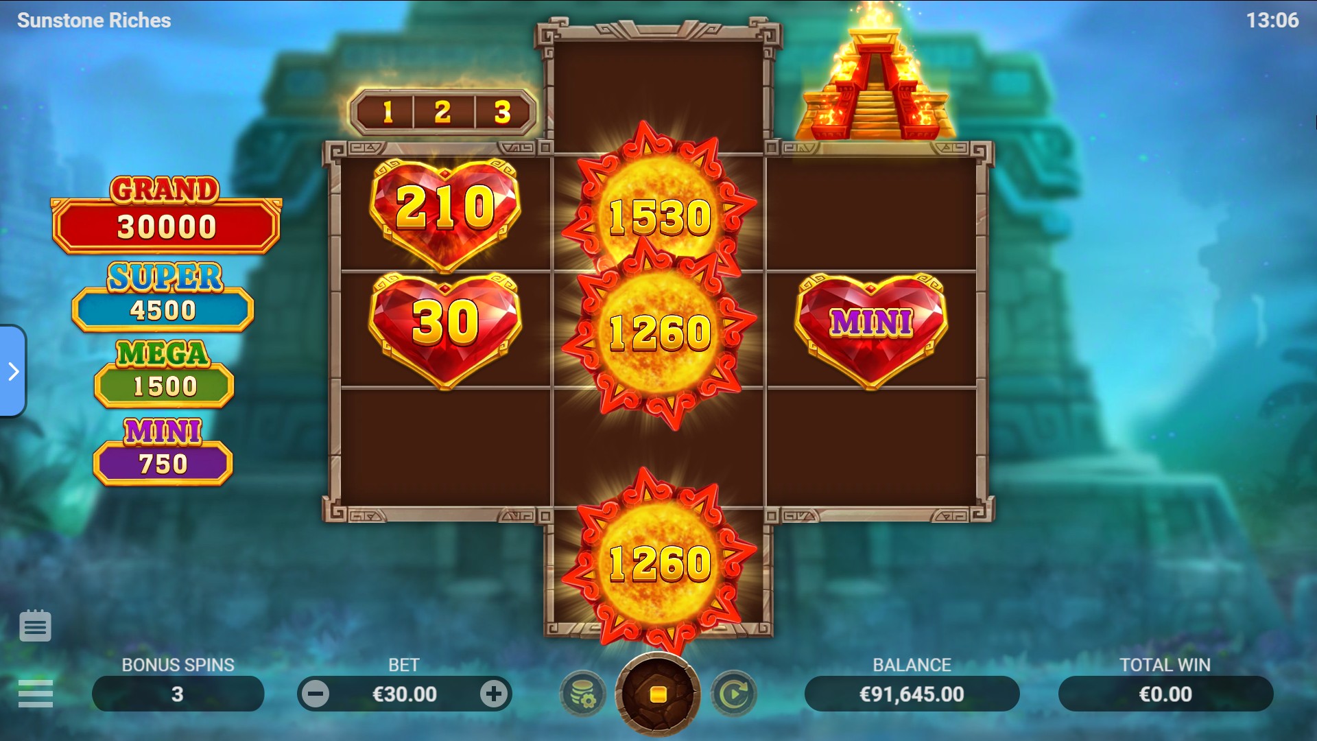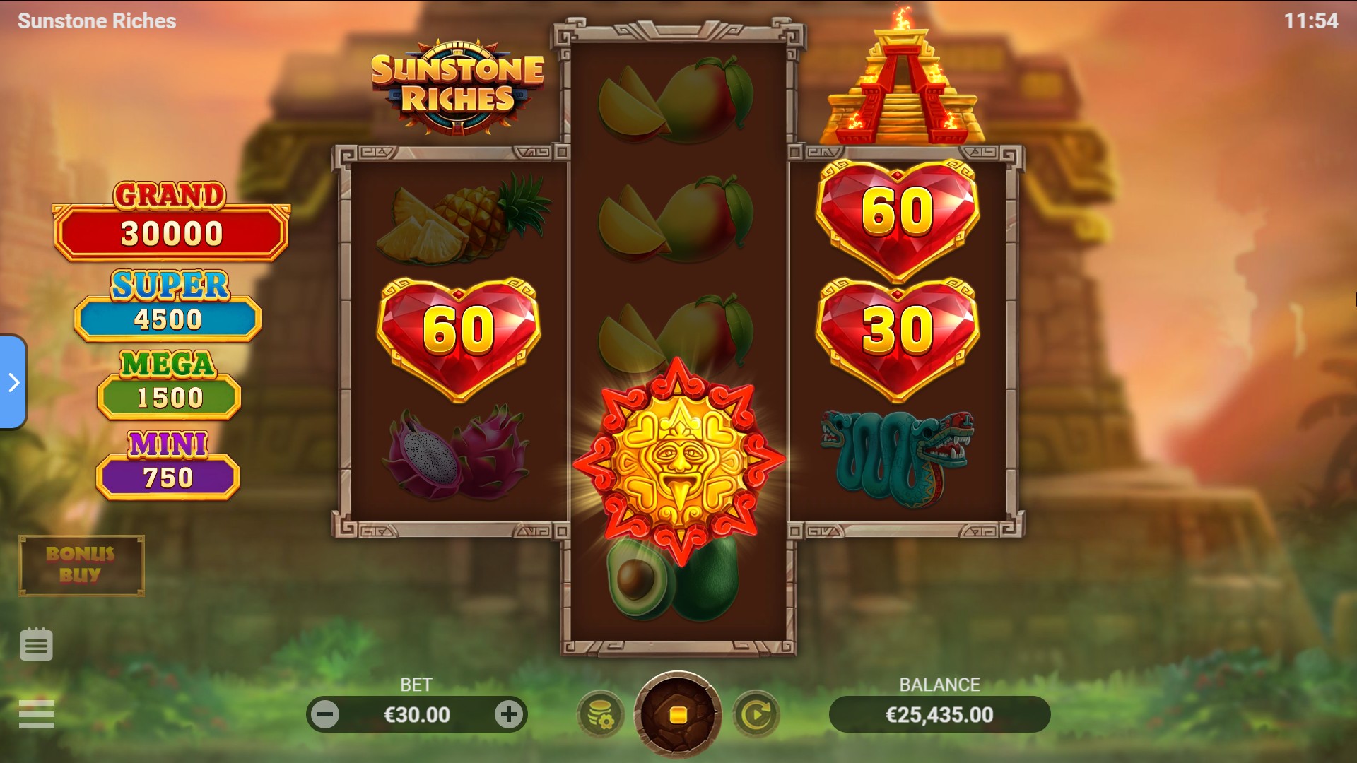 Frutas exóticas, ídolos dorados y artefactos mágicos relucen en los rodillos, y el poderoso Bono Solar ilumina la pantalla con destellos de luz y grandes premios. Cuando los símbolos de bonificación coinciden, las puertas del templo se abren y comienza el Juego de Bonificación, donde las recompensas brillan aún más.