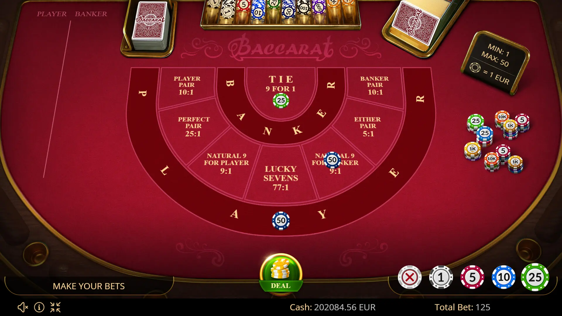 Evoplay represents its own version of one of the most popular games in the world – Baccarat. In the game, you will find not only classic bets but also additional bets for every taste and with high payouts. Our unique offer is a payout bonus on the bet for Lucky Sevens. Very simple game rules and a friendly interface will make a comfortable and enjoyable pastime in the game. To try to play Baccarat free online, you just need to put on one of the proposed results of the draw, click the “Deal” button and follow the progress of the game.