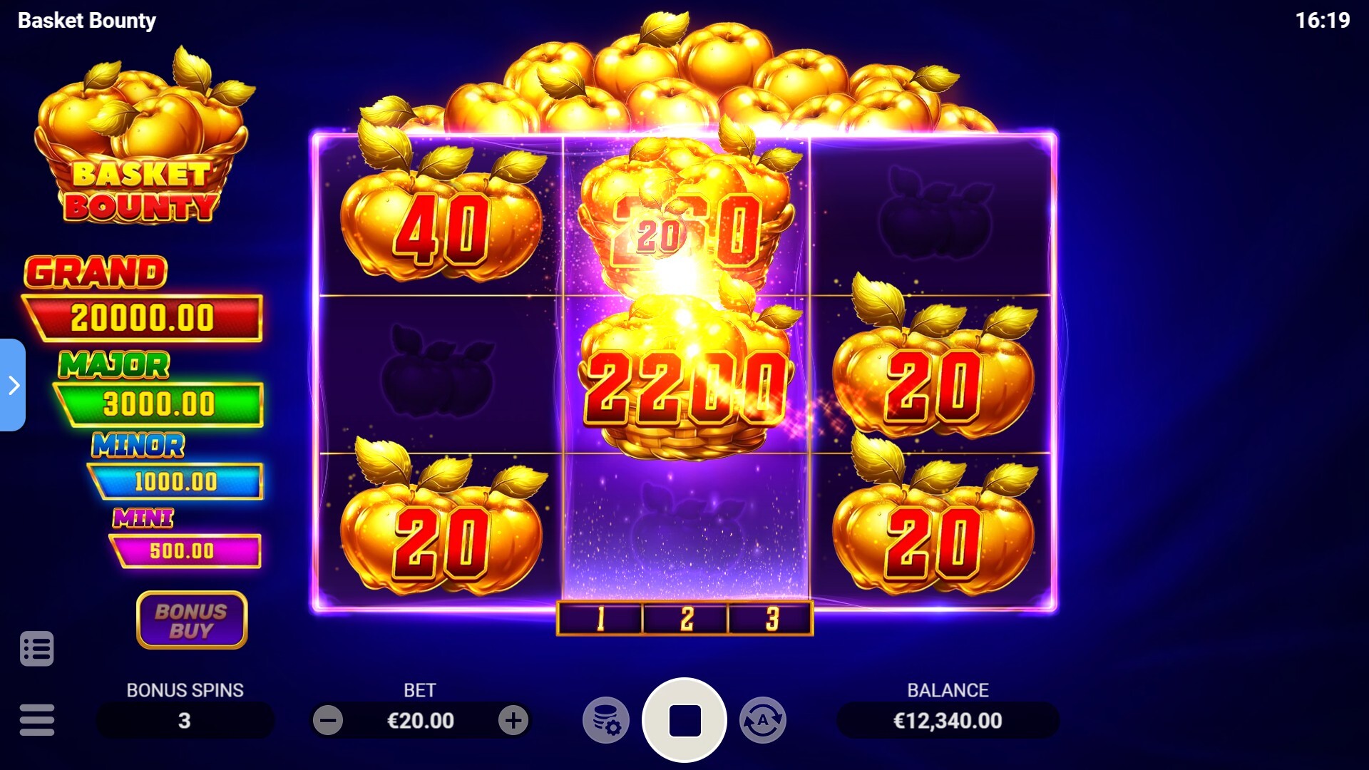 In any position on the reels, 2 Bonus symbols and 1 Basket Bonus activate the Bonus game. The Bonus game always starts with 3 spins, and each time a new Bonus symbol lands, the spins count resets back to 3. -