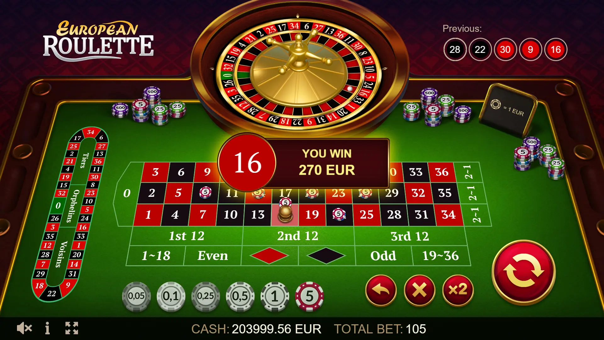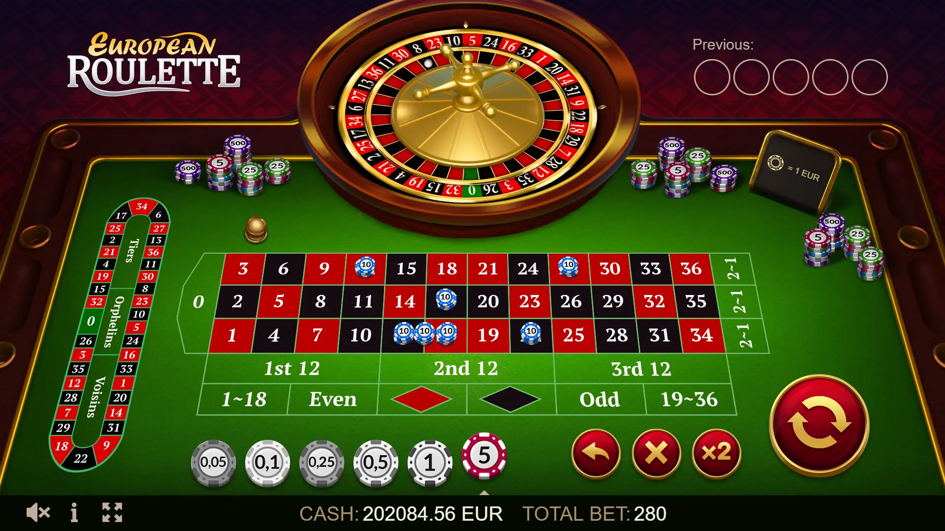 For the convenience of players on the European Roulette screen, there is a field with the last five results. Also, you can try European Roulette play for free and see for yourself how exciting this game is!