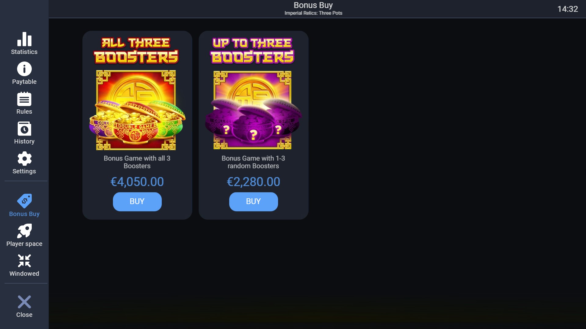 The Bonus Buy feature allows you to purchase and instantly trigger the Bonus Game with one, two, or all three boosters active.