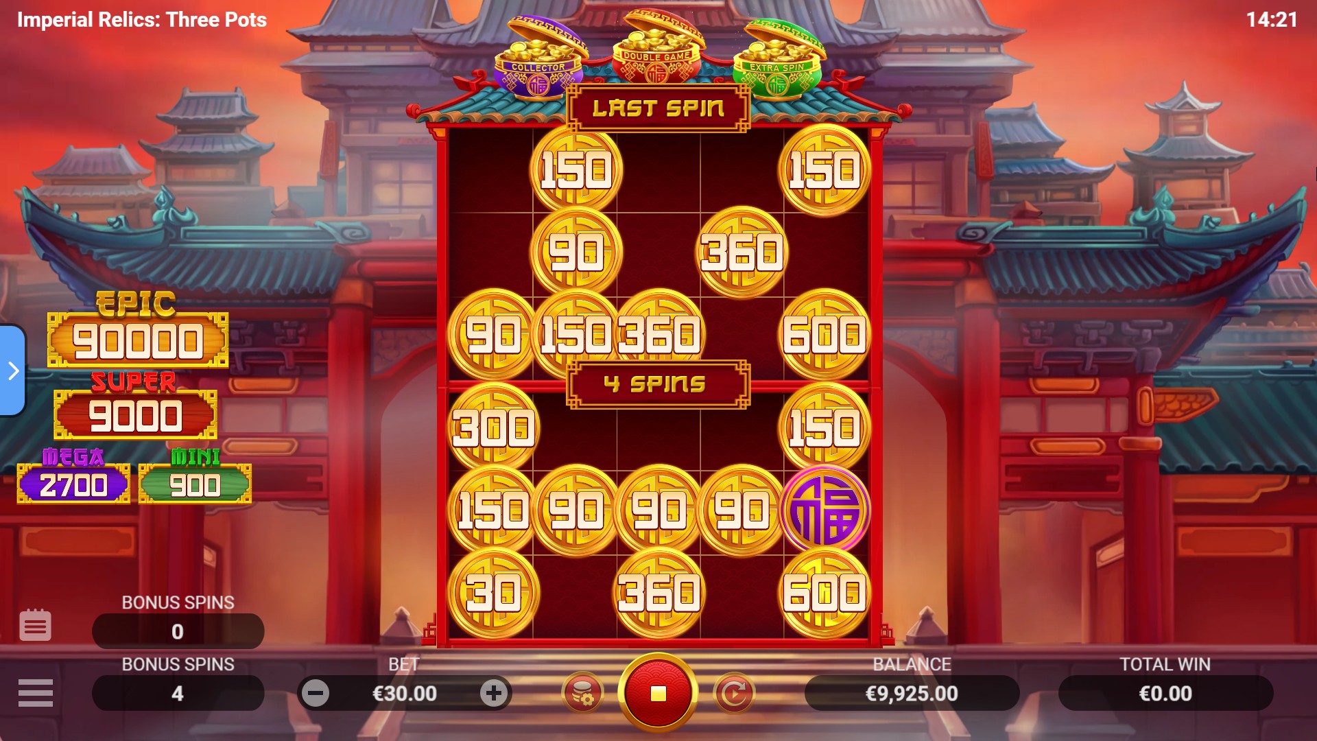 There are 4 types of Bonus symbols in the game: Red, Purple, Green, and Gold. All Bonus symbols contain either random values or fixed jackpots: Mini, Mega, or Super. In the main game, any Purple, Red, or Green Bonus symbol that lands on the reels can trigger the Bonus Game with its respective booster. -