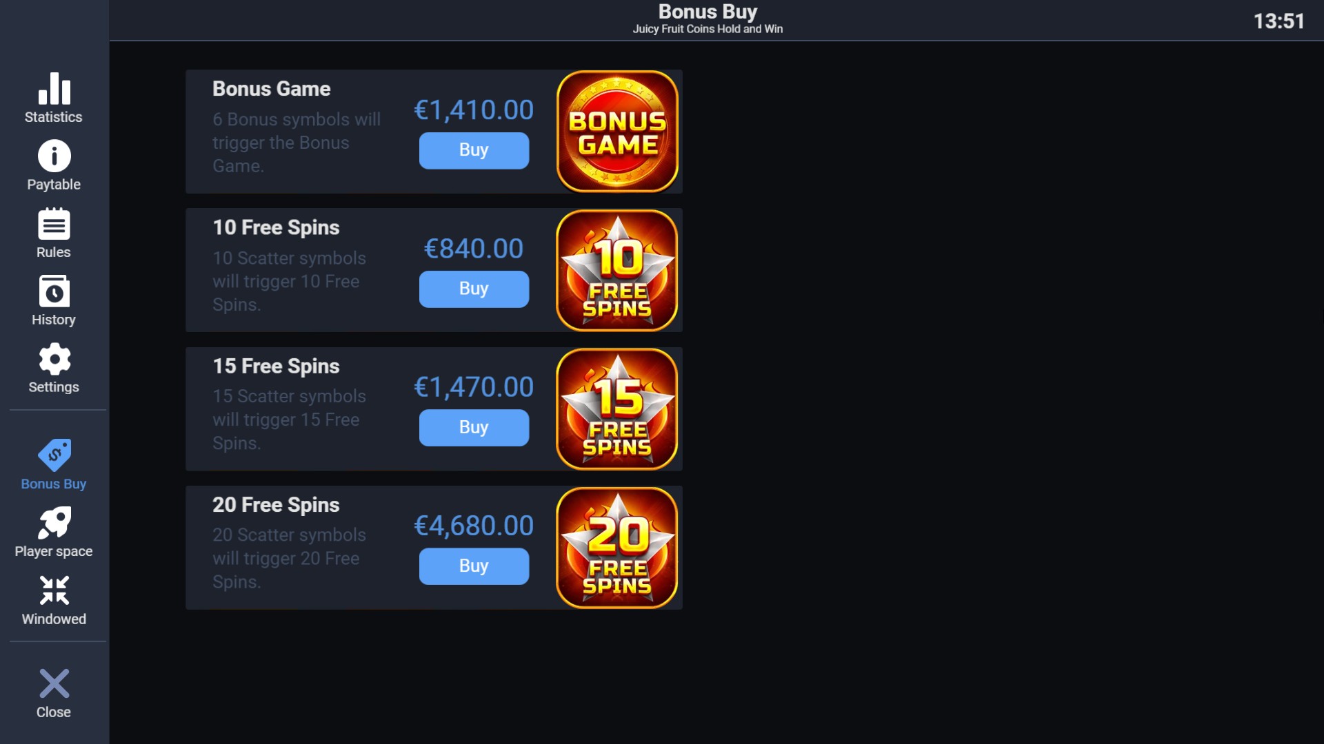 Juicy Fruit Coins Hold and Win brings the classic fruit machine atmosphere into a bright modern slot format. Five reels and ten fixed paylines reward matching symbols from left to right, with larger combinations delivering higher payouts. The Wild helps complete winning lines, while the Scatter activates Free Spins for extended play. Bonus and Hot Bonus symbols add extra excitement through instant rewards and the Bonus Game, where collected prizes are combined and paid out at the end.