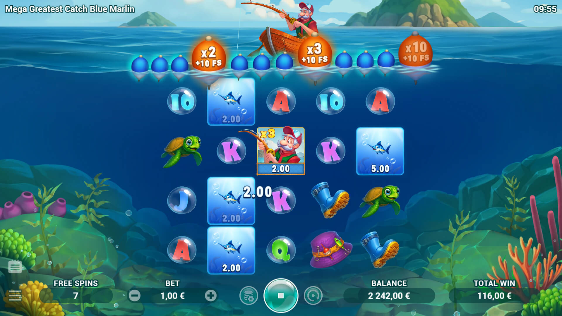 When Wild and Fish symbols are present, every Wild symbol catches all Fish symbols on the reels. All Fish’s values are collected and added to any other regular winning round combinations. Every 4th Wild symbol that lands on the reels awards 10 extra Free Spins and increases the Fishing feature multiplier:• x2 after the first 4 Wilds;• x3 after the next 4 Wilds;• x10 after the final 4 Wilds. -