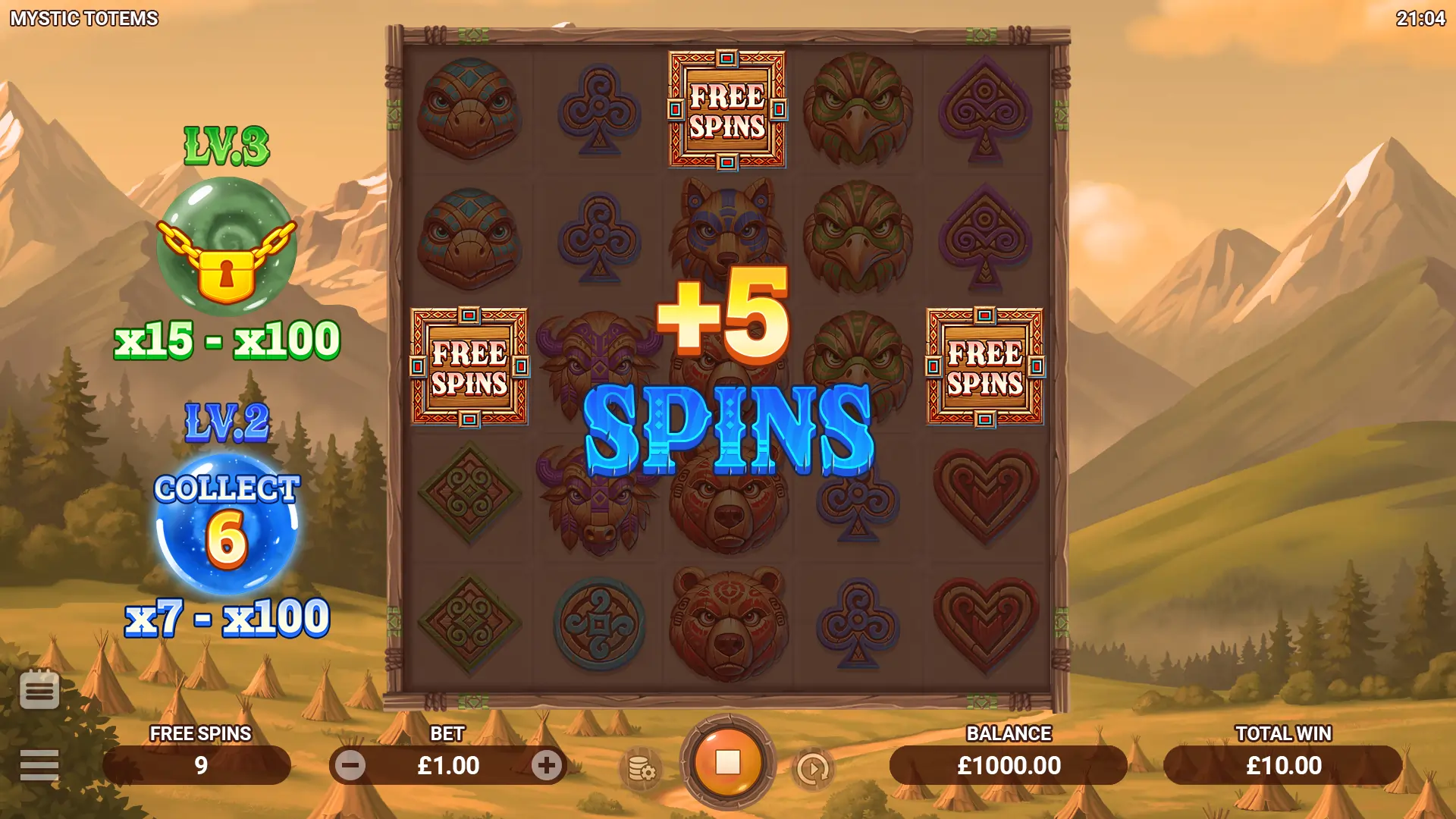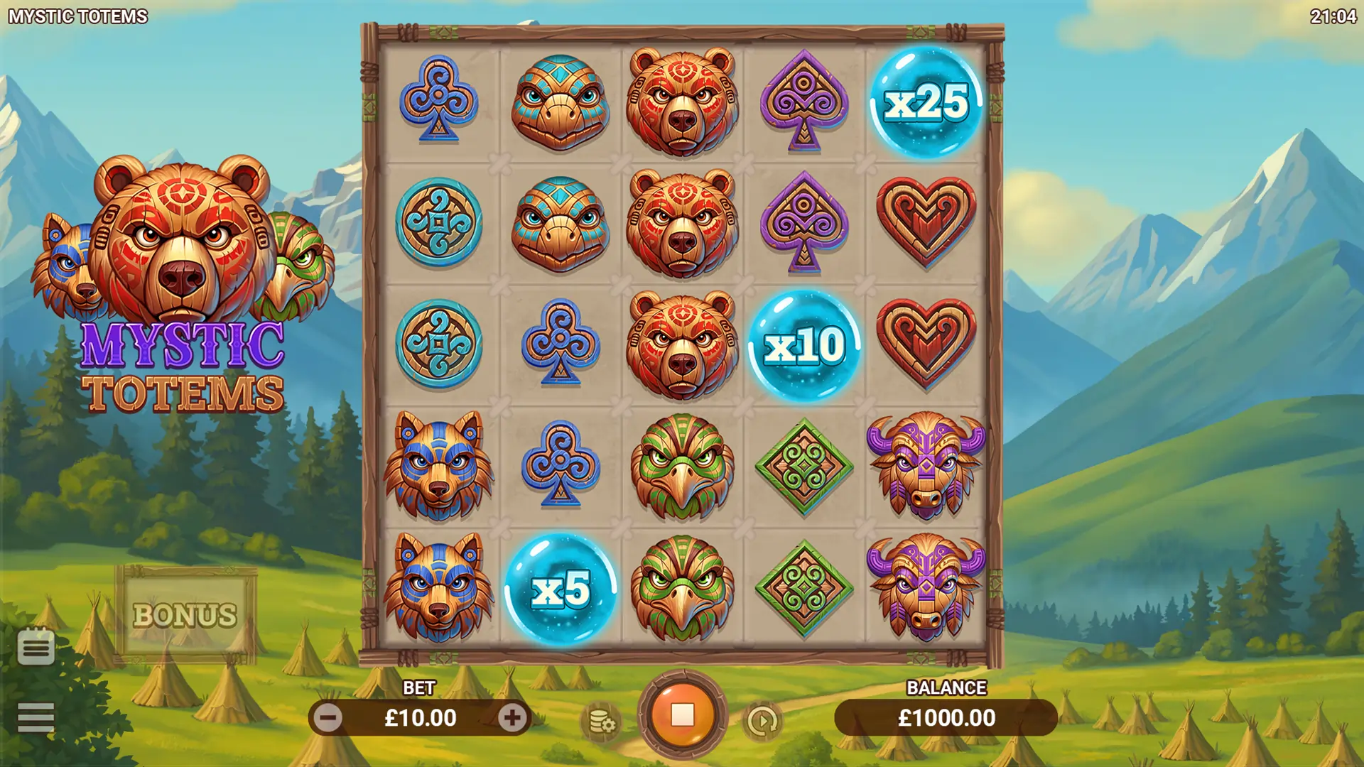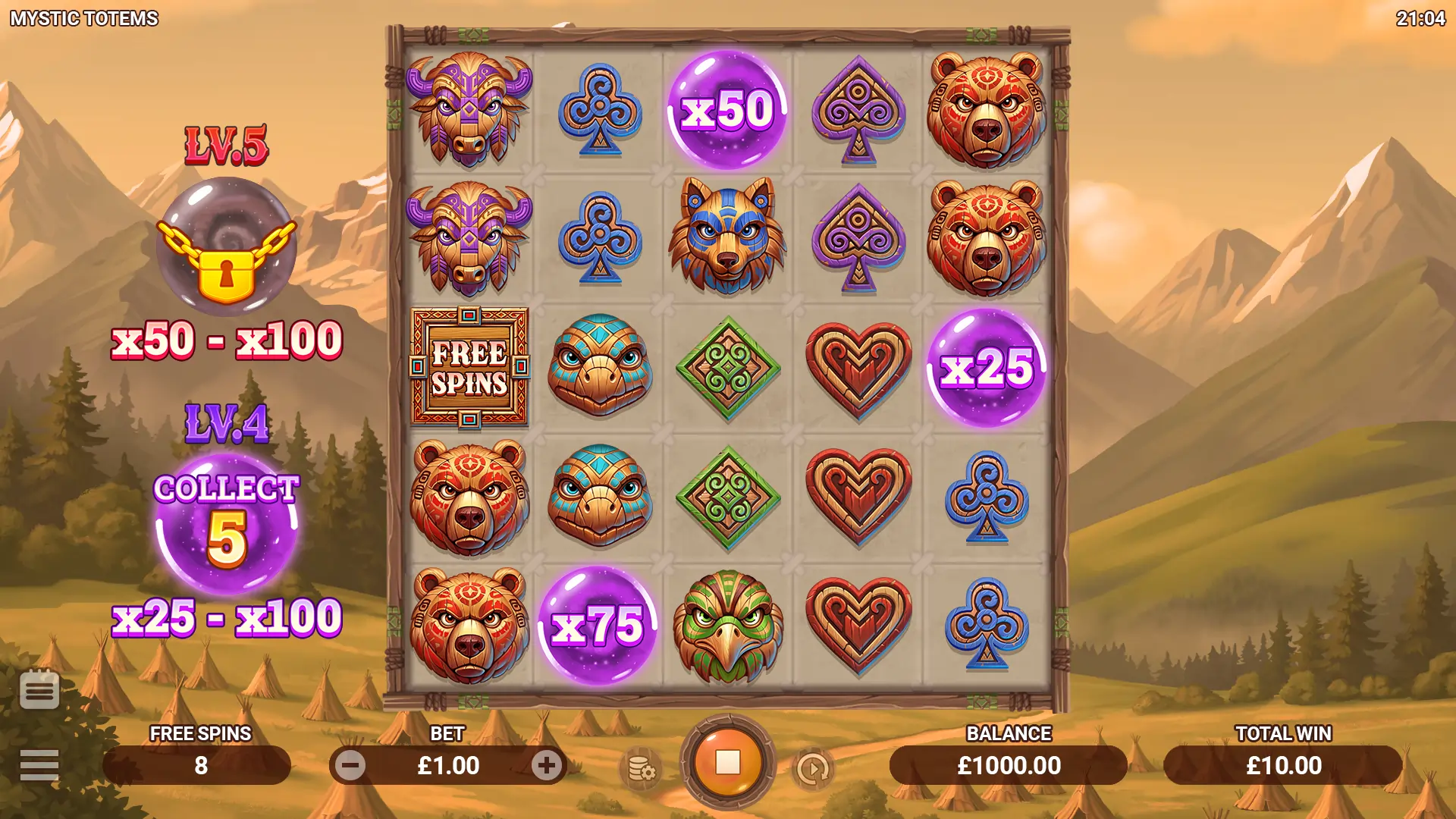 Carved masks of majestic bears, watchful eagles, powerful wolves, and sacred tribal emblems fill the grid, surrounded by misty mountains and timeless magic. Land 6 or more matching symbols anywhere on the reels to claim a win. The more symbols you gather, the stronger the reward. One of the most thrilling aspects is the progressive Mystery Orb levels. As you collect more Mystery Orbs, the multipliers grow stronger, increasing your chances of landing a big win.