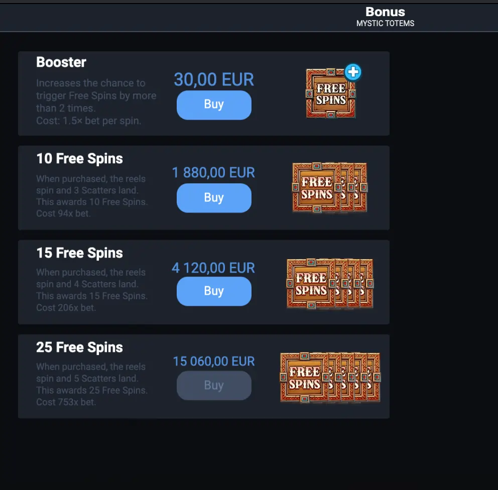 Select a bonus option from the menu. You can choose only one option at a time. Selecting it again will deselect it. The total bet displayed is the cost per spin for the selected bonus. If your balance is insufficient, the Spin button will be disabled. The Bonus Buy is available only in the Base Game and not in all markets.